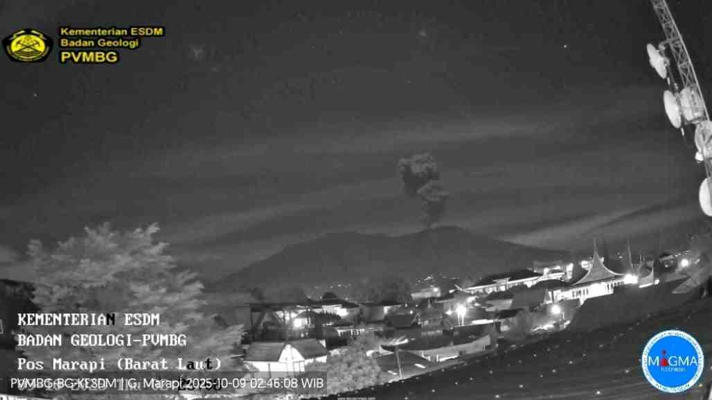 SUMBAR - Gunung Marapi Sumatera Barat kembali erupsi hari ini, Kamis, 9 Oktober 2025 pukul 02.21 WIB dengan tinggi kolom abu teramati ± 1.200 meter di atas puncak (± 4.091 m di atas permukaan laut).
