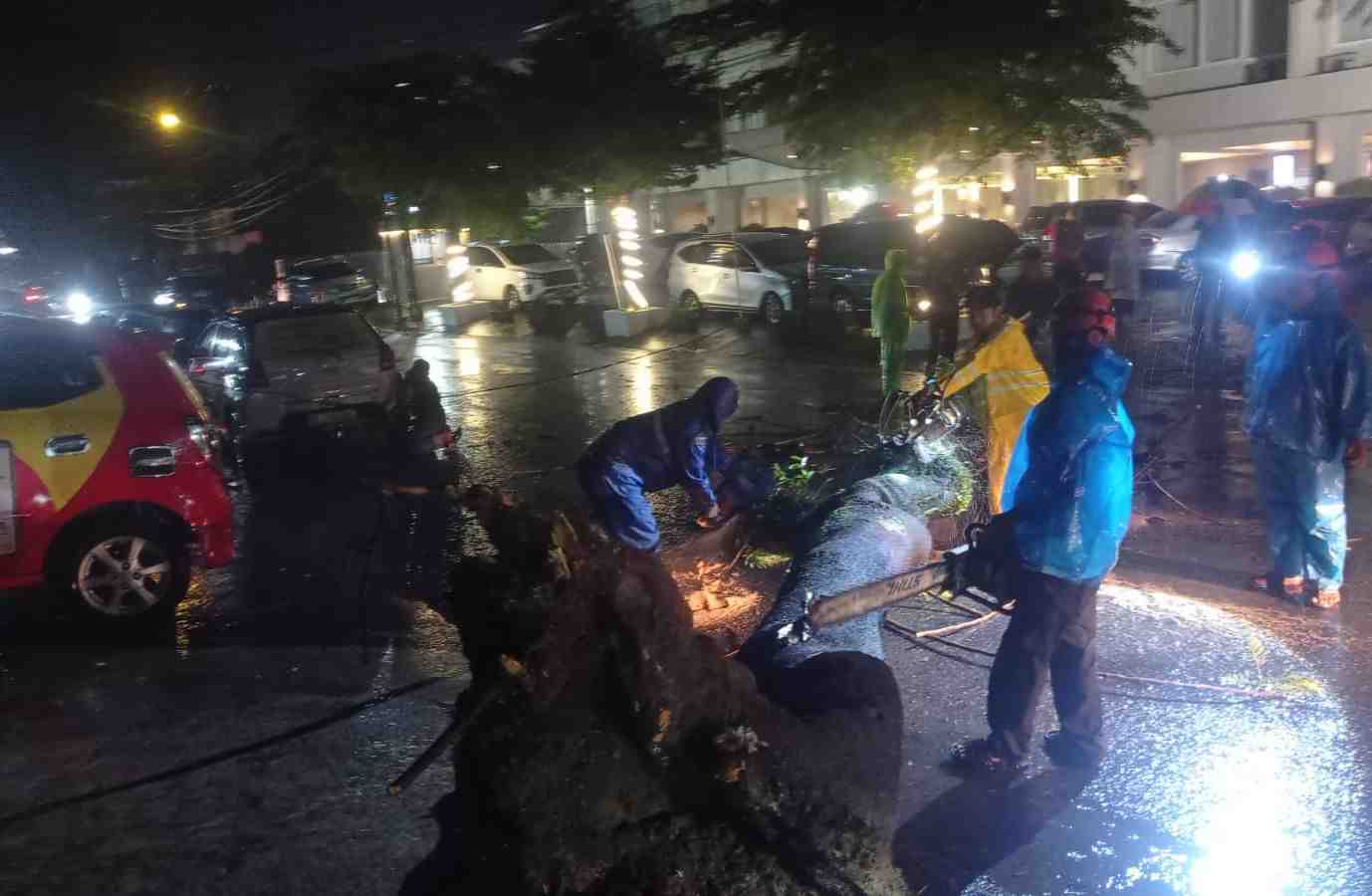 PADANG – Hujan deras disertai angin kencang yang melanda Kota Padang malam ini, Sabtu, 22 November 2025 menyebabkan satu batang pohon jenis patai-patai tumbang dan menutup total akses jalan di Jalan Dobi, tepatnya di depan Hotel Pangeran City, Kelurahan Kampung Pondok, Kecamatan Padang Barat.