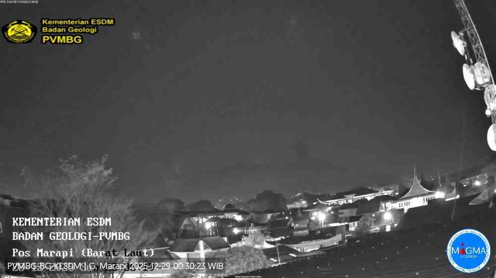 SUMBAR - Gunung Marapi Sumatera Barat kembali erupsi hari ini, Minggu, 28 Desember 2025 pukul 23.33 WIB dengan tinggi kolom abu teramati ± 900 meter di atas puncak (± 3.791 m di atas permukaan laut).
