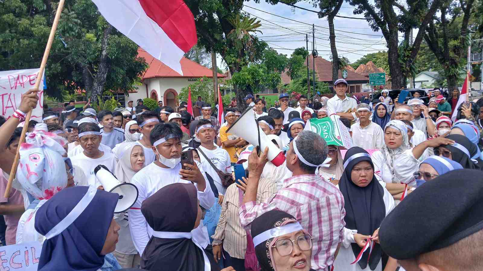 PADANG - Puluhan pedagang Pasar Raya Padang mengelar aksi unjuk rasa di depan Rumah Dinas Wali Kota Padang, Jalan Jenderal Ahmad Yani, Senin, 9 Februari 2026.