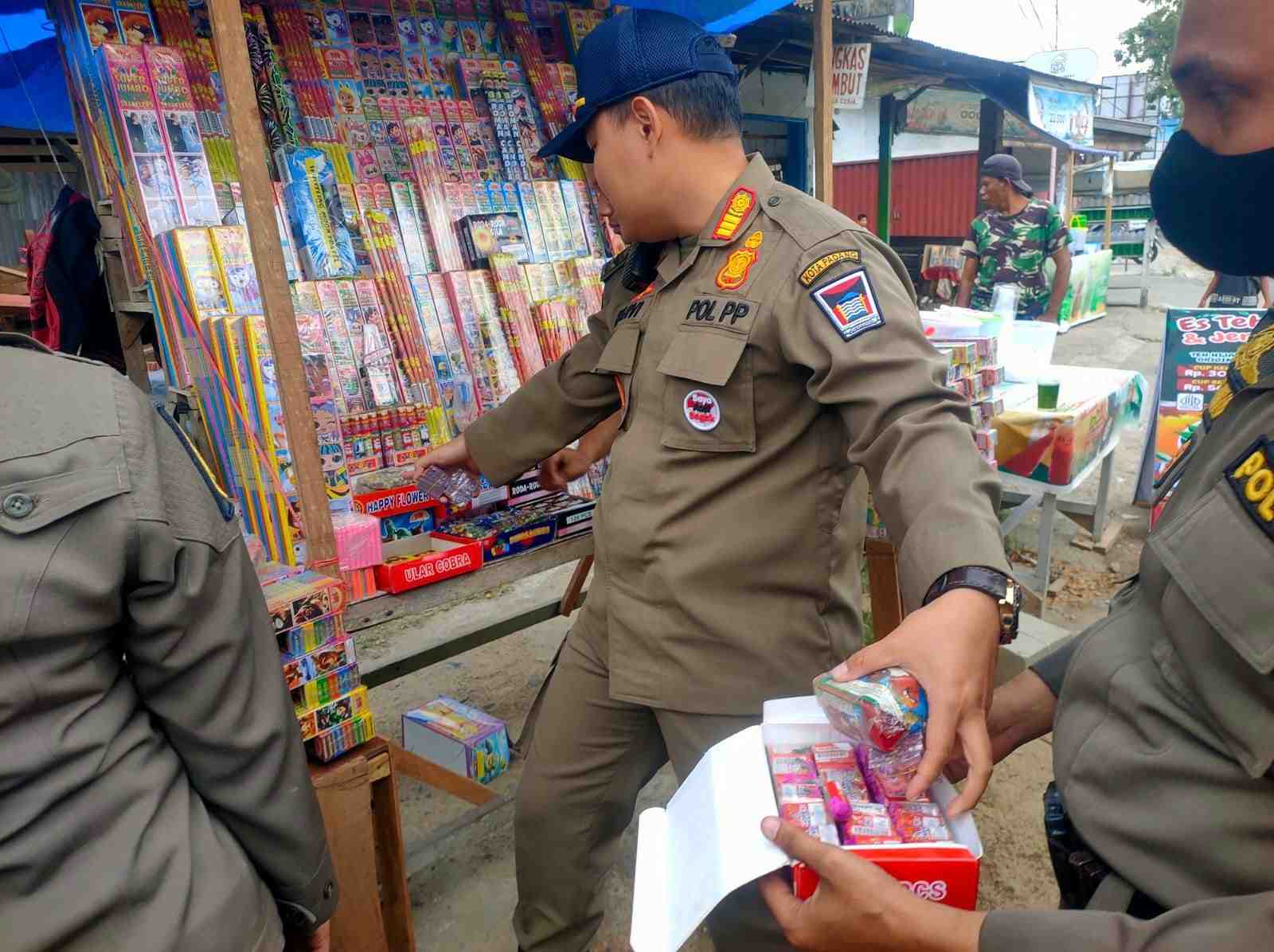 PADANG - Satuan Polisi Pamong Praja (Satpol PP) Kota Padang melakukan penertiban terhadap pedagang kaki lima (PKL) yang nekat menjual petasan di sejumlah wilayah, Senin, 2 Maret 2026.