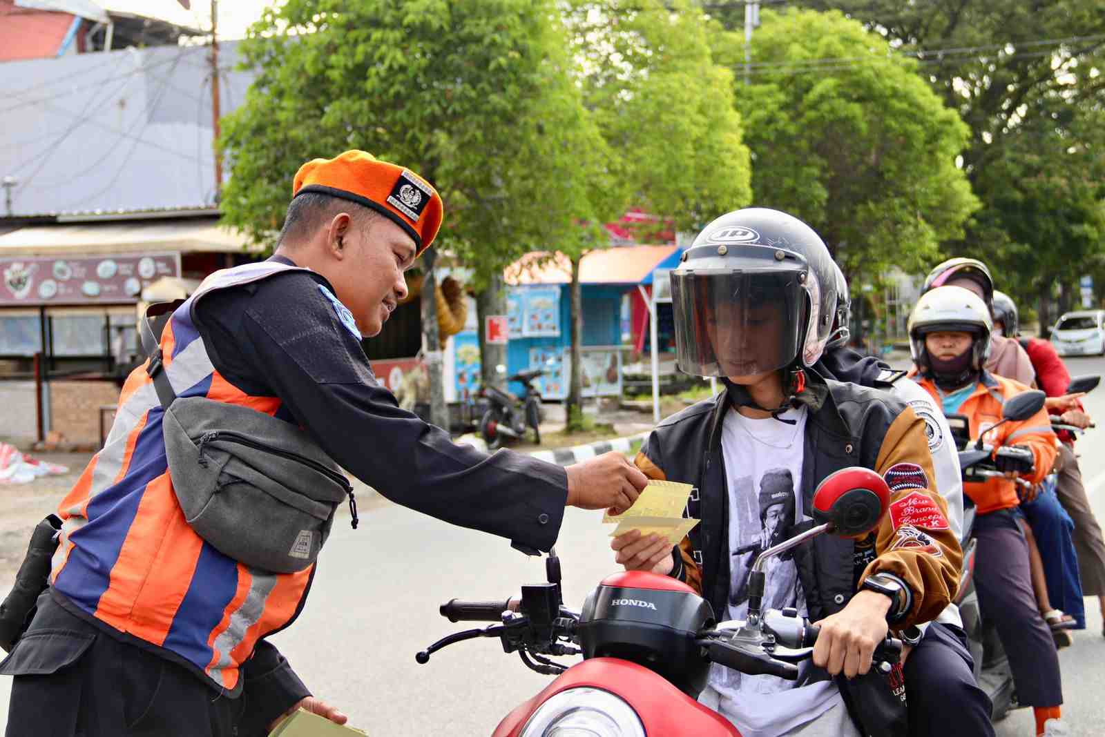 Dalam kegiatan tersebut, petugas memberikan imbauan secara langsung kepada pengguna jalan melalui pengeras suara, memasang media sosialisasi berupa spanduk, serta membagikan stiker bertema keselamatan dengan pesan “Berhenti Sejenak, Tengok Kanan Kiri, Pastikan Aman, Lanjutkan Perjalanan.”